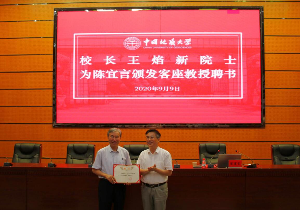 校长王焰新院士为陈宜言教授颁发客座教授聘书、并佩戴校徽。王焰新在致辞中回顾了学校与陈宜言教授的深厚友谊,赞美了陈宜言教授的家国情怀,对陈宜言教授多年以来对我校的关心和支持以及向学校捐赠寿山石表示由衷的感谢并谈到:“陈大师捐赠这块石头,蕴含了先生对故乡大好山河的深情眷恋和对学校基业长青的美好祝愿!”