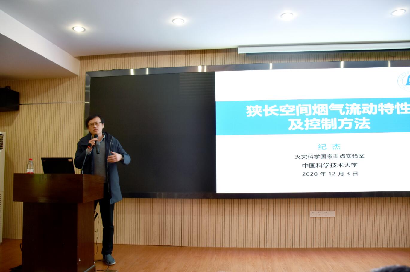 纪杰教授的报告围绕“狭长空间烟气流动特性及控制方法”开展。首先,他简述了狭长受限空间典型火灾案例与的分类,并重点讲解了隧道火灾这一典型狭长受限空间的主要研究方法。其次,基于近年来的研究,剖析了隧道火灾羽流与烟气蔓延行为、壁面的影响效应、火焰尺度、温度和有毒气体浓度的演化表征模型。此后,基于实际隧道的工程应用,对城市地下公路隧道自然排烟、机械排烟有效性、低压环境隧道烟气输运特征进行了详细介绍。最后,结合现阶段的研究,提出了基于数据同化的隧道火灾发展预测方法的前沿科学挑战。会后,纪杰教授与参会师生展开了隧道火灾学术交流,并由罗学东副院长对报告会进行了总结发言。