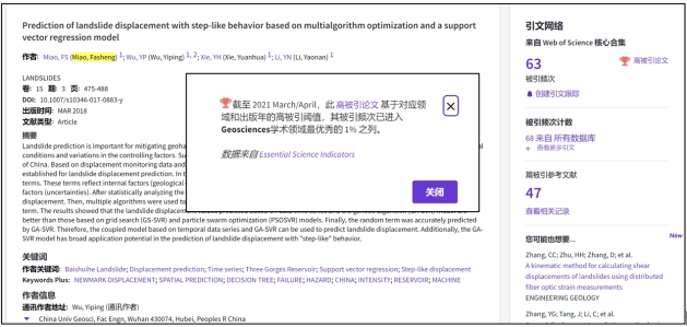 (通讯员:黄静)根据2021年7月基本科学指标数据库(Essential Science Indicators,简称ESI)最新数据显示,巨乳做爱 苗发盛副教授、吴益平教授团队于2018年在国际工程地质领域顶级期刊《Landslides》上发表的学术论文“Prediction of landslide displacement with step-like behavior based on multialgorithm optimization and a support vector regression model” 入选ESI高被引论文(Highly Cited Paper)。