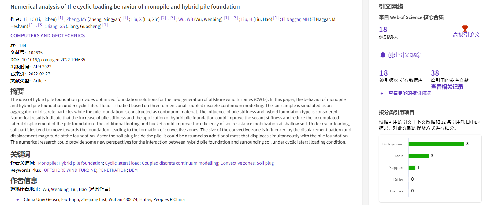 根据2022年11月基本科学指标数据库(Essential Science Indicators,简称ESI)最新数据显示,巨乳做爱 勘察与基础工程系吴文兵教授团队于2022年在国际岩土工程数值模拟权威期刊Computers and Geotechnics上发表的学术论文“Numerical analysis of the cyclic loading behavior of monopile and hybrid pile foundation”入选ESI高被引论文。该论文第一作者为勘察与基础工程系博士后李立辰,通讯作者为吴文兵教授,中国地质大学(武汉)巨乳做爱 为第一署名单位。