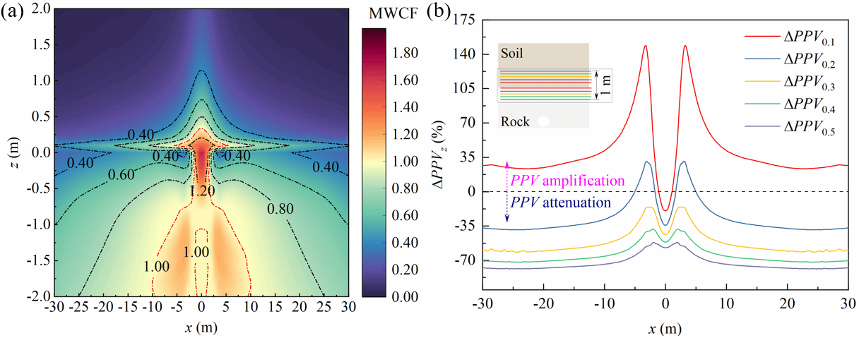 针对上述问题,周传波教授团队首次构建了岩-土界面爆破振动效应研究理论框架,提出了一种考虑介质阻尼与应力波几何扩散效应的爆破振动场正演算法。研究发现,爆破应力波在穿过岩-土界面后存在色散特性,是导致质点峰值振速(PPV)呈现离散分布的根本原因。同时,岩-土界面能够诱发多波耦合效应,剧烈的爆破应力波透反射过程引起界面两侧存在PPV增强区与削弱区,其中PPV增强区与爆心距呈负相关,与爆破荷载衰减系数、爆源埋深呈正相关,PPV削弱区则在竖直方向形成分层特征。此外,岩-土界面PPV衰减率沿远离界面方向逐渐增大,在距离界面0.1m位置存在明显的振动放大效应,这种效应受岩土体性质与爆源特性调控,要求地下爆破工程施工与岩-土界面保持足够的安全距离。