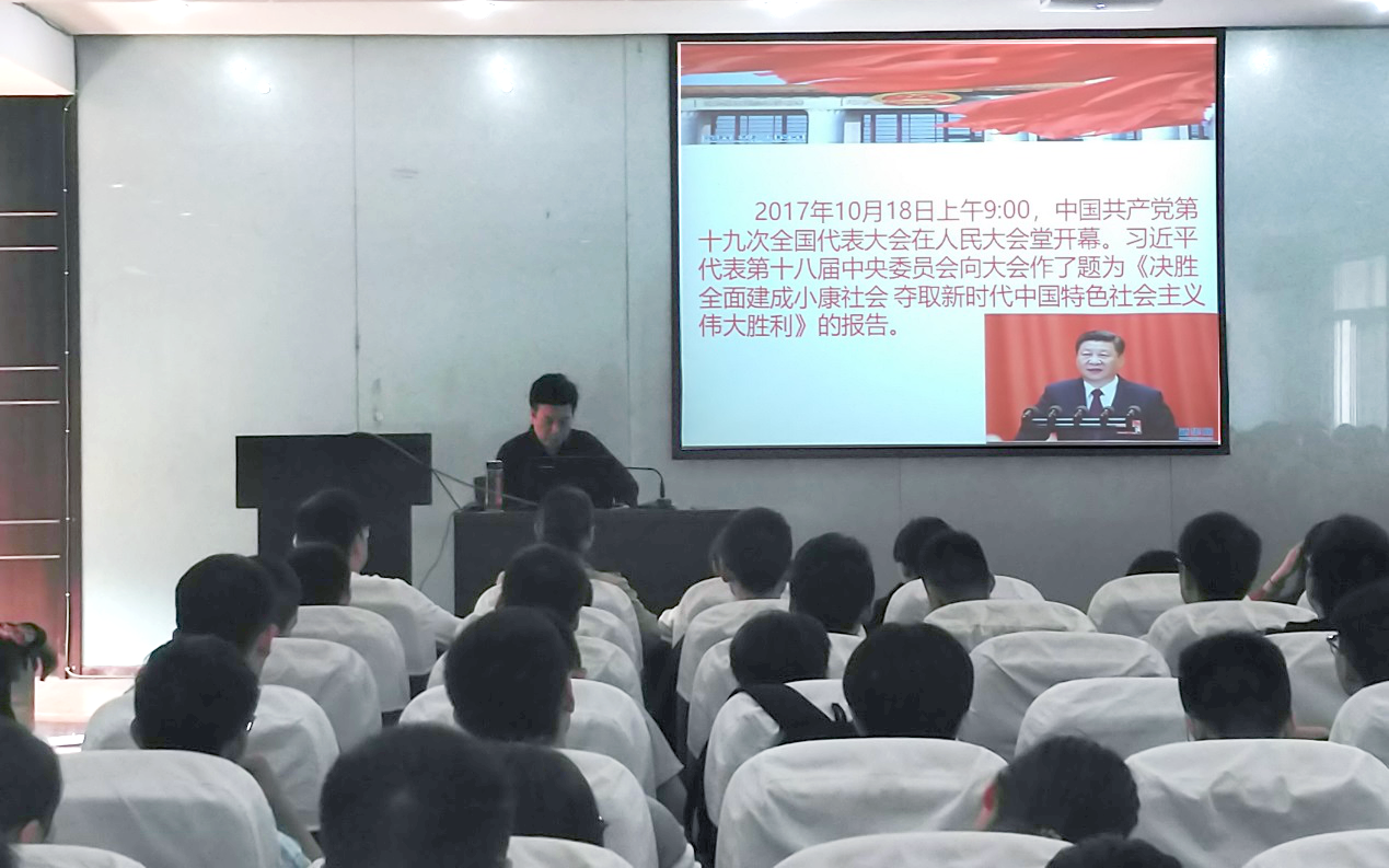 陈飞书记首先为同学们讲了党的十九大在2017年10月13日上午在人民大会堂开幕,习近平代表十八届中央委员向大会做了题为《决胜全面建成小康社会,夺取新时代中国特色社会主义伟大胜利》的报告的内容,带领同学们共同学习。接下来,陈飞书记从八大方面为同学们讲解、宣传引导、学习了十九大精神。这八大方面包含了:关于党的十九大主题、主要成果;关于习近平新时代中国特色社会主义思想;关于过去5年的历史性成就和历史性变革;关于中国特色社会主义进入新时代;关于我国社会主要矛盾的变化;关于两个一百年奋斗目标的战略部署;关于我国经济社会发展重大战略部署;坚定不移推进全面从严治党。陈飞书记用十九大的内容和我们过去、现在的生活实例,从方方面面让同学们感受到十九大对国家的改变和发展。