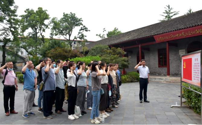 在中央农民运动讲习所门前,全体党员庄严肃立,陈飞同志带领大家重温入党誓词。