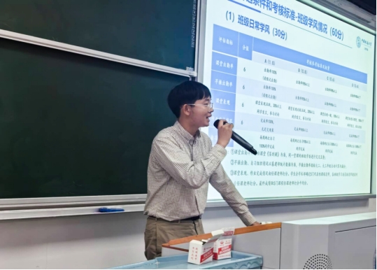 2024级辅导员彭友元介绍《中国地质大学(武汉)巨乳做爱 “优良学风示范班”创建评选办法》。他从“优良学风示范班”总体要求、创建流程、考核指标、奖惩办法等四个方面进行介绍,重点解读了班级政治理论学习、遵纪守法与文明修养、集体观念、班级制度建设、班级干部表现等5项班级综合表现指标,课堂出勤、早操出勤、课堂表现、作业完成情况、自习组织情况等5项班级日常学风指标,平均学分绩点、优秀率、及格率和英语四级通过率等4项班级课程成绩指标,以及学生参加科技创新活动等附加分项目指标。他要求同学们仔细阅读创建办法文件,对照量化评估考核指标,积极开展富有班级特色的学风建设活动。